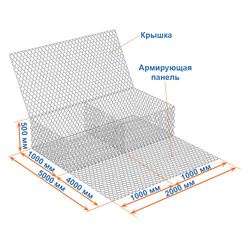 Габион с армирующей панелью 5x2x0,5 – это коробчатый габион с удлиненным основанием, которое образует подобие «хвоста».